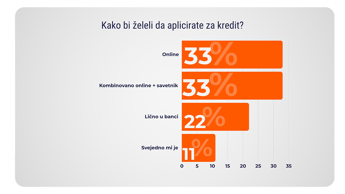 Na kraju, 11% ispitanika navodi da im je svejedno kako apliciraju, što ukazuje na manji segment korisnika koji nema izraženu preferenciju, već im je najvažniji krajnji rezultat – dobijanje kredita pod povoljnim uslovima.