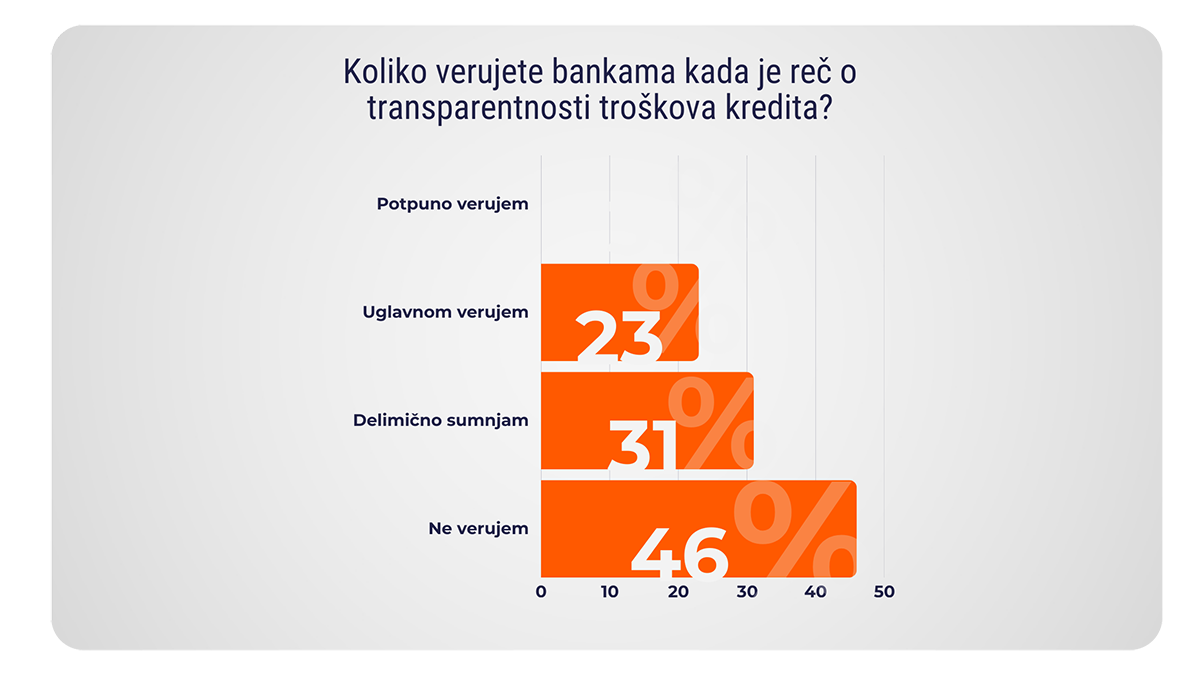Ovi podaci jasno pokazuju da čak 77% ispitanika ima određeni nivo sumnje ili potpunog nepoverenja kada su u pitanju bankarski troškovi. Posebno zabrinjava činjenica da niko od ispitanika nije izjavio da u potpunosti veruje bankama.