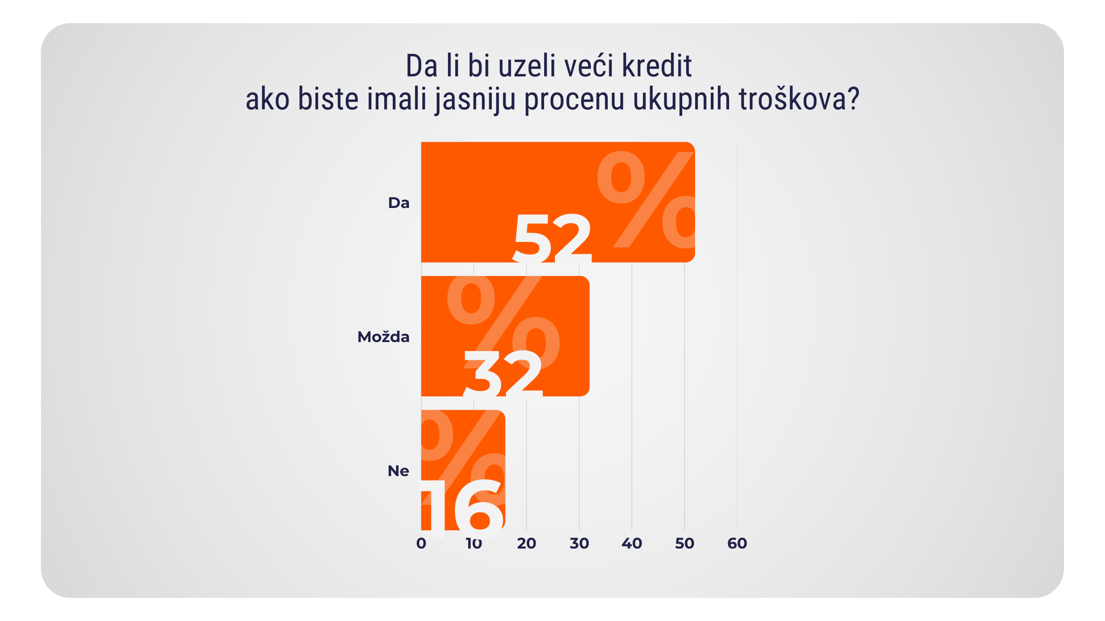 Ovi procenti jasno ukazuju da većina građana doživljava promenjivu kamatu kao faktor rizika, naročito u vremenu čestih promena na finansijskom tržištu i rasta referentnih kamatnih stopa. Kada saberemo odgovore koji potvrđuju zabrinutost građana, 89% je izrazila zabrinutost u vezi promenjive kamatne stope.