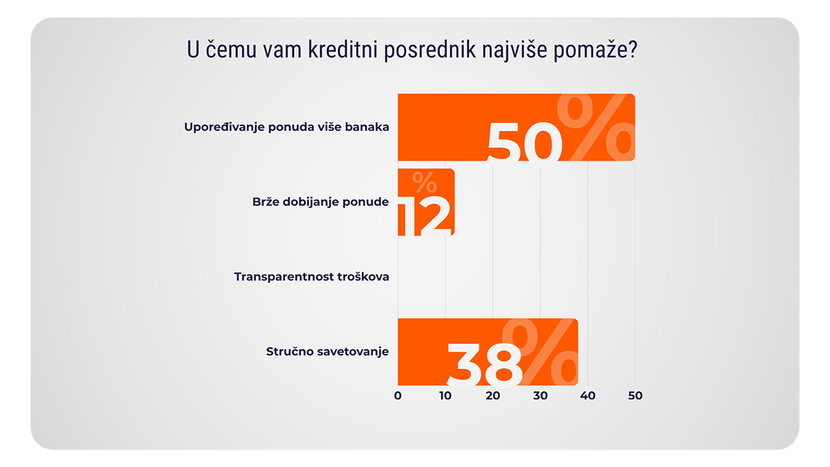 Zanimljiv podatak je da 0% ispitanika smatra da im kreditni posrednik najviše pomaže u transparentnosti troškova. Ovo može ukazivati na to da korisnici transparentnost već podrazumevaju kao standard, ali i na činjenicu da mnogi nisu svesni koliko skriveni troškovi mogu uticati na ukupnu cenu kredita. Upravo tu kreditni savetnik ima važnu ulogu – da sve činjenice iznese na svetlo i jasno pokaže koji kredit je dugoročno najbolji izbor u datom momentu.